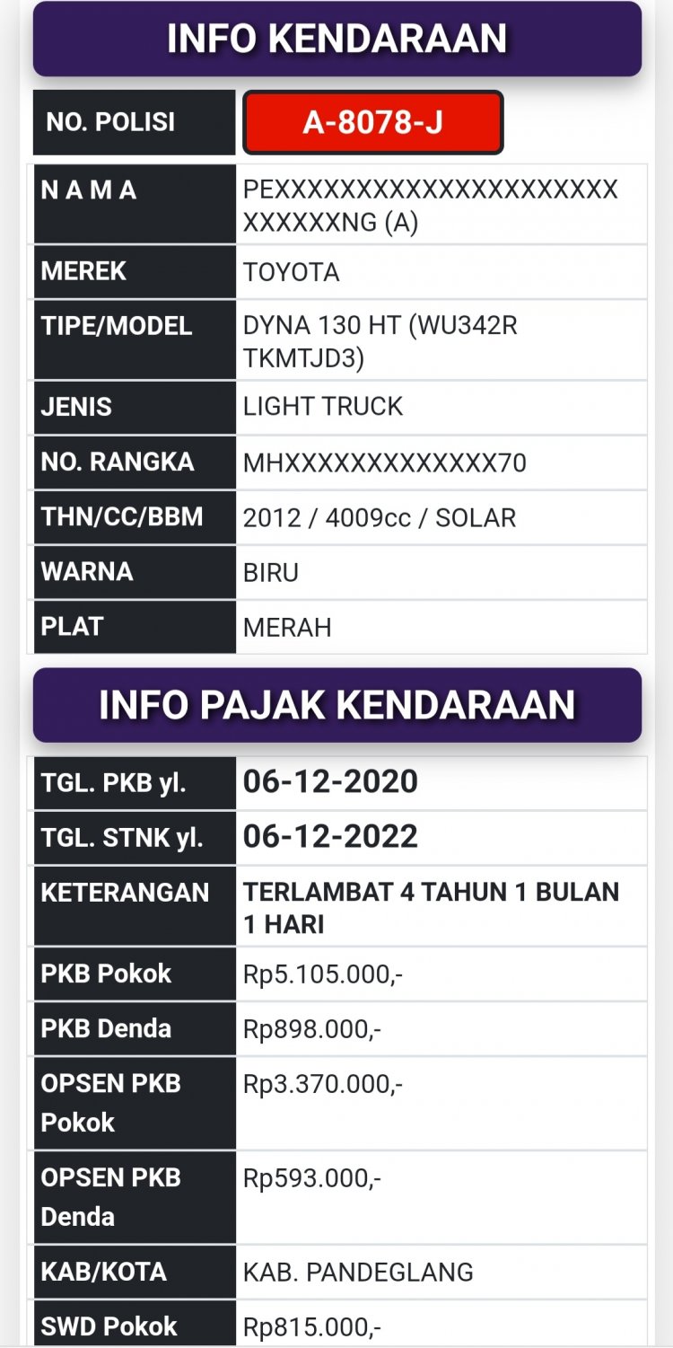 Pada aplikasi Pengecekan Pajak Kendaraan terlihat jelas Merek Mobil Ligh Truck Toyota Dyna 140 HT, milik pemda Pandeglang telah telambat membayar pajak selama 4 Tahun 1 bulan pertanggal 7 Januari 2025.