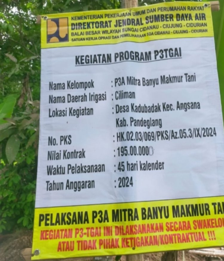 Justice-post.com Pandeglang, Banten,| Kelompok P3A Mitra Banyu Makmur Tani Desa Kadubadak Kecamatan Angsana Kabupaten Pandeglang Provinsi Banten, Yang saat ini sedang Melakukan pekerjaan pembangunan Program P3-TGAI drainase irigasi dengan titik lokasi Didesa Kadubadak, dengan nilai Anggaran Rp. 195.000.000,- (seratus sembilan puluh lima juta rupiah) No PKS.HK.02.03/069/PKS/Az.05.3/IX/2024. Diduga tak sesuai spek dan dikerjakan asal-asalan.