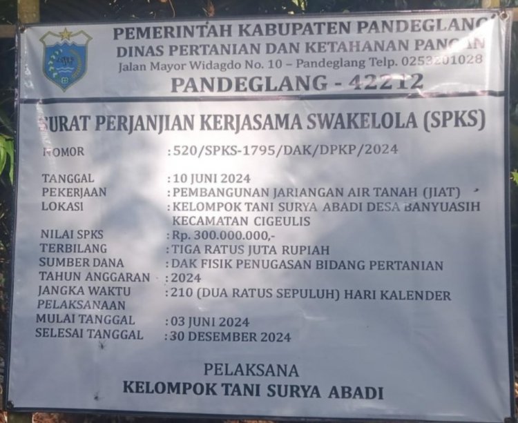 alpawolfnews.com, Pandeglang, Banten | Dinas Pertanian dan Ketahan Pangan Kabupaten Pandeglang pada tahun 2024 ini sangat fokus melaksanakan program untuk kemajuan Pertanian, program tersebut dikerjakan oleh Kelompok tani diwilayah Kabupaten Pandeglang, Tapi miris diduga dua Kelompok Tani yang menerima Program tahun 2024 dikelola oleh Perangkat Desa (Prades) dan Aparatur Sipil Negara (ASN) didesa Banyu Asih Kecamatan Cigeulis.