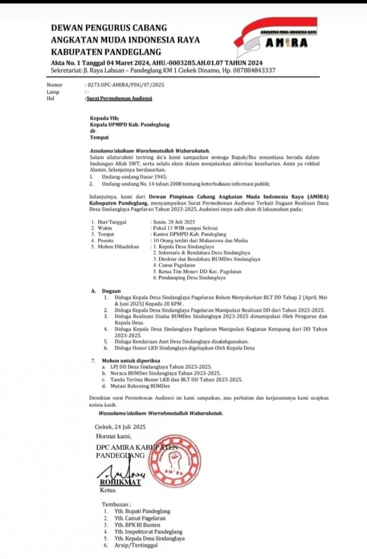 Insya allah kami DPC AMIRA Pandeglang akan lakukan Audiensi Ke DPMPD Terkait Dugaan Manipulasi Dana Desa Sindanglaya pada hari Senin 28 Juli 2025, dan surat sudah kami sampaikan. Tutupnya