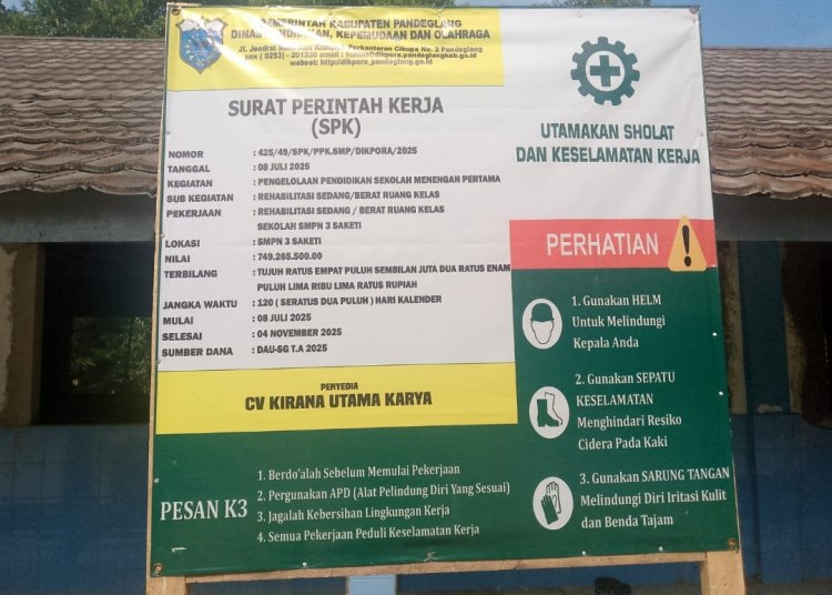 Proyek Rehabilitasi Ruang Ruang Kelas SMPN 3 Saketi, kontarktor CV. Kirana Utama Karya, dengan nomor kontrak 425/49/SPK/PPK.SMP/Dikpora/2025 yang bersumber dari DAU, SG.TA.2025 nilai Pagu Rp. 749.265.500 dinilai kurang pengawas pemerintah dalam hal ini Dinas Tenaga Kerja dan Transmigrasi Kabupaten Pandeglang & Dinas Pendidikan Kepemudaan dan Olahraga Kabupaten Pandeglang