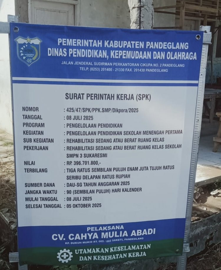 alpawolfnews.com, Pandeglang, Banten | Rehabilitasi ruang kelas SMPN 3 Sukaresmi, Kecamatan Sukaresmi, Kabupaten Pandeglang yang dilaksanakan oleh CV. Cahaya Mulia Abadi dengan menyerap anggaran sebesar Rp. 396.701.800,- diduga tidak sesuai spesifikasi, standar maupun kualitasnya. Kamis, 21/08/2025.