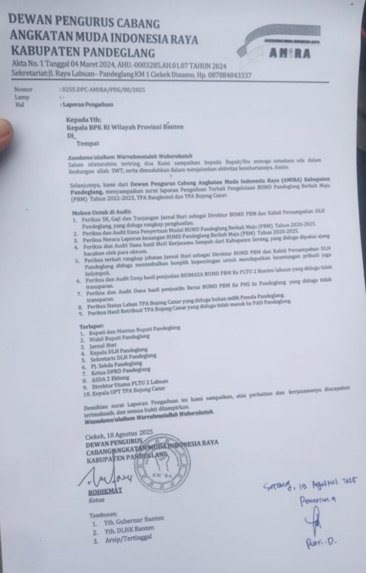 alpawolfnews.com, Pandeglang, Banten | Ketua Dewan Pengurus Cabang Angkata Muda Indonesia Raya (AMIRA) Kabupaten Pandeglang menyanpaikan Laporan Pengaduan Ke BPK RI Perwakilan Banten Pada Selasa, (19/08/2025), terkait rangkap jabatan Jaenal Huri Direktur BUMD Pandeglang Berkah Maju (PBM) yang menjabat sebagai Kepala Budang Persampahan Dinas Lingkungan Hidup (DLH) Kabupaten Panglang, juga terkait dugaan KKN Pengelolaan Keuangan BUMD PBM.